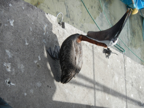 While I was at the fish market, the pelicans and sea lions hang around looking for handouts or droppings. If you notice this pelican has a fish in his throat and is working it down to his stomach.