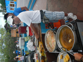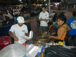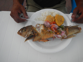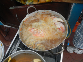 After the market closed, a street vendor set up shop with his whole family. He deep fried some kind of fish whole…head, tail, etc….People where lined up for it. You got a whole fish, rice (of course) some fried bananas and salad. All for $5. The way they fix the fried bananas is quite interesting. They peel them (obviously) slice them into two-inch chunks, deep fry them, then mash them with a mallet and deep fry them again. The are delicious. I’ve had them several times in restaurants.