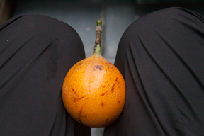 It’s in the passion fruit family and is a Granedilli. (I’m not sure on the spelling.) We stopped for a snack and got this along with a small cheese and preserve sandwich and a small chocolate bar. The inside of this fruit is like small sacks of a substance with a seed in each sack. You suck it out of the peeling and chew up the seed. It is very sweet and tastes great. The seed is like eating a rice crispie.
