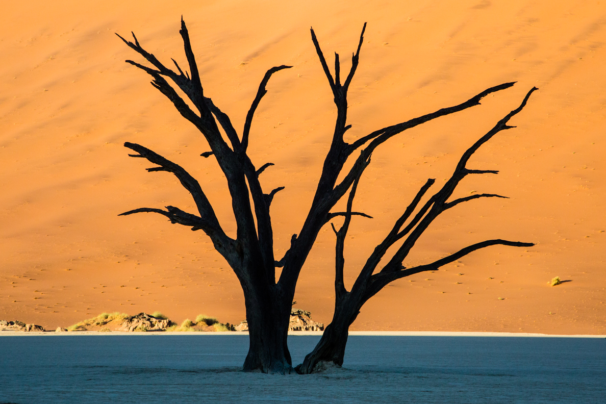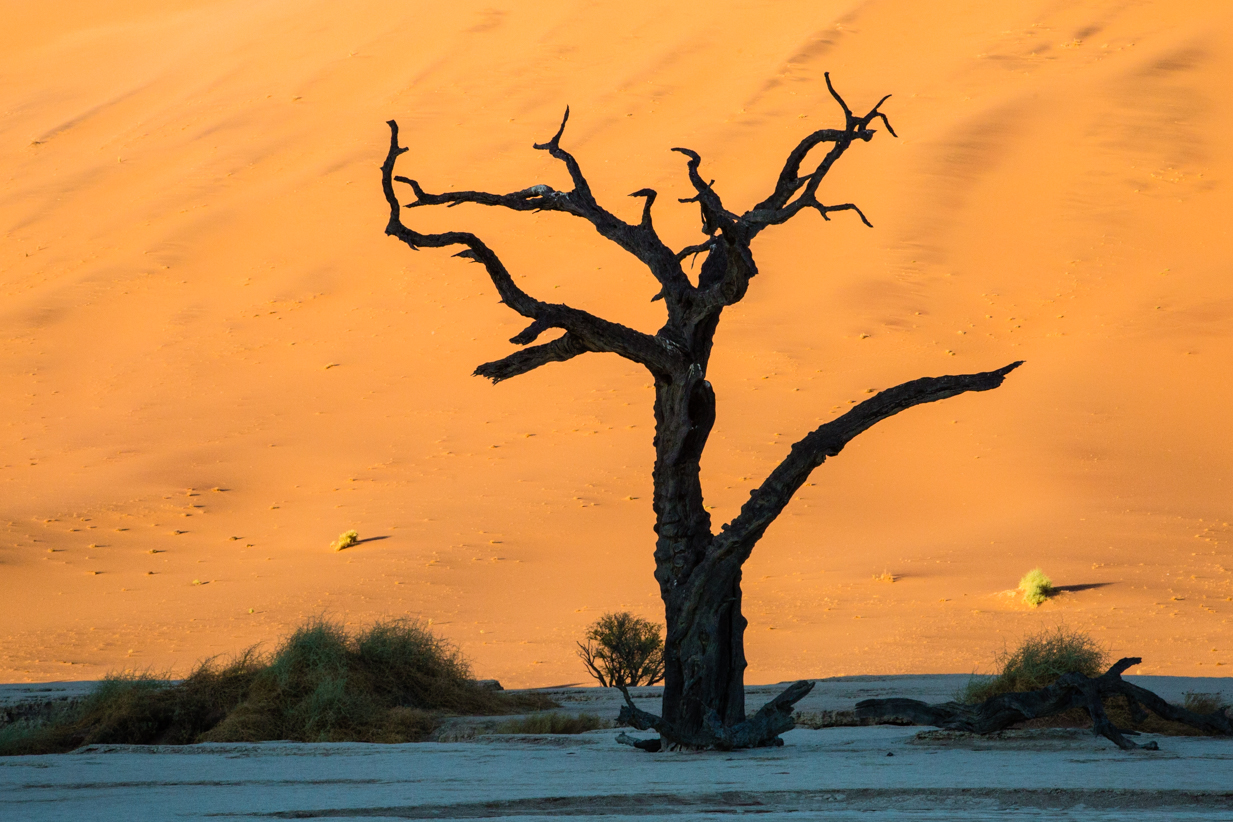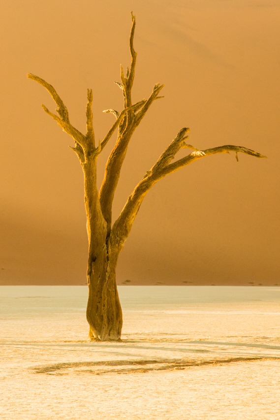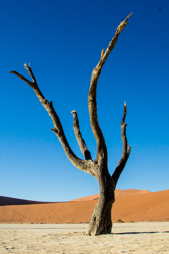 I wanted to photograph an area called Deadvlei. It is a white clay pan that once was a shallow pool of water that allowed camel thorn trees to grow. When the climate changed, drought came and the sand dunes encroached on the area and cut off the water supply. The trees died. It’s believed the trees died 600-700 years ago but because it is so dry here they don’t decompose.