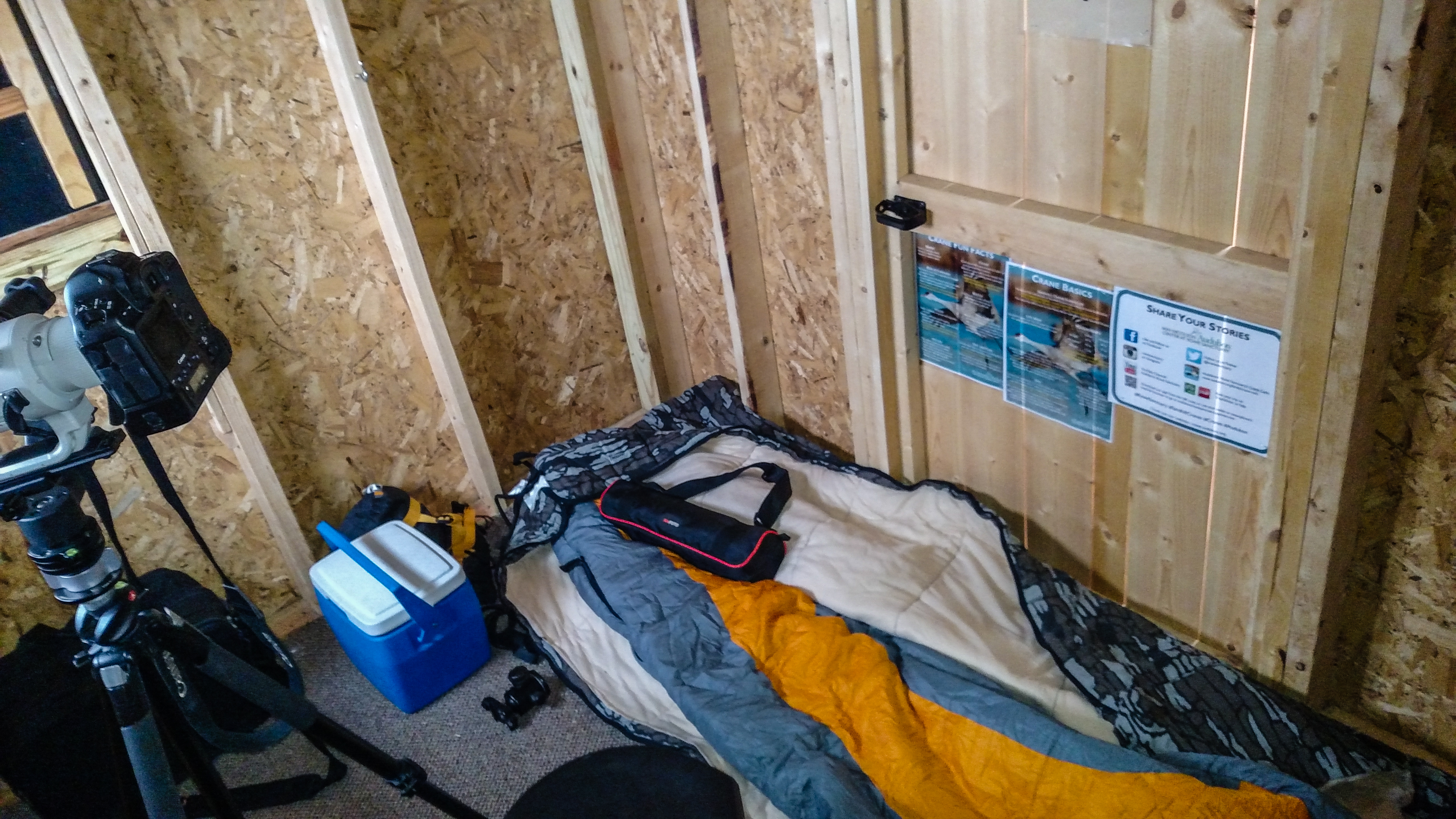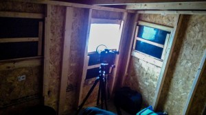 The blinds are 7′ high x 8′ long x 6′ deep. It has four wooded window openings, two on the front and one on each end. They are basically your neighborhood garden shed. The rules are quite simple. A guide delivers you to your blind between 4-5pm and they come and get you around 9am the next morning. You are not allowed to leave the blind, nor stick your lens or your head or arms outside the windows. I was in my blind for 17 hours. You bring a couple of sleeping bags and whatever food and water you’d like. No fires or heaters are allowed either.