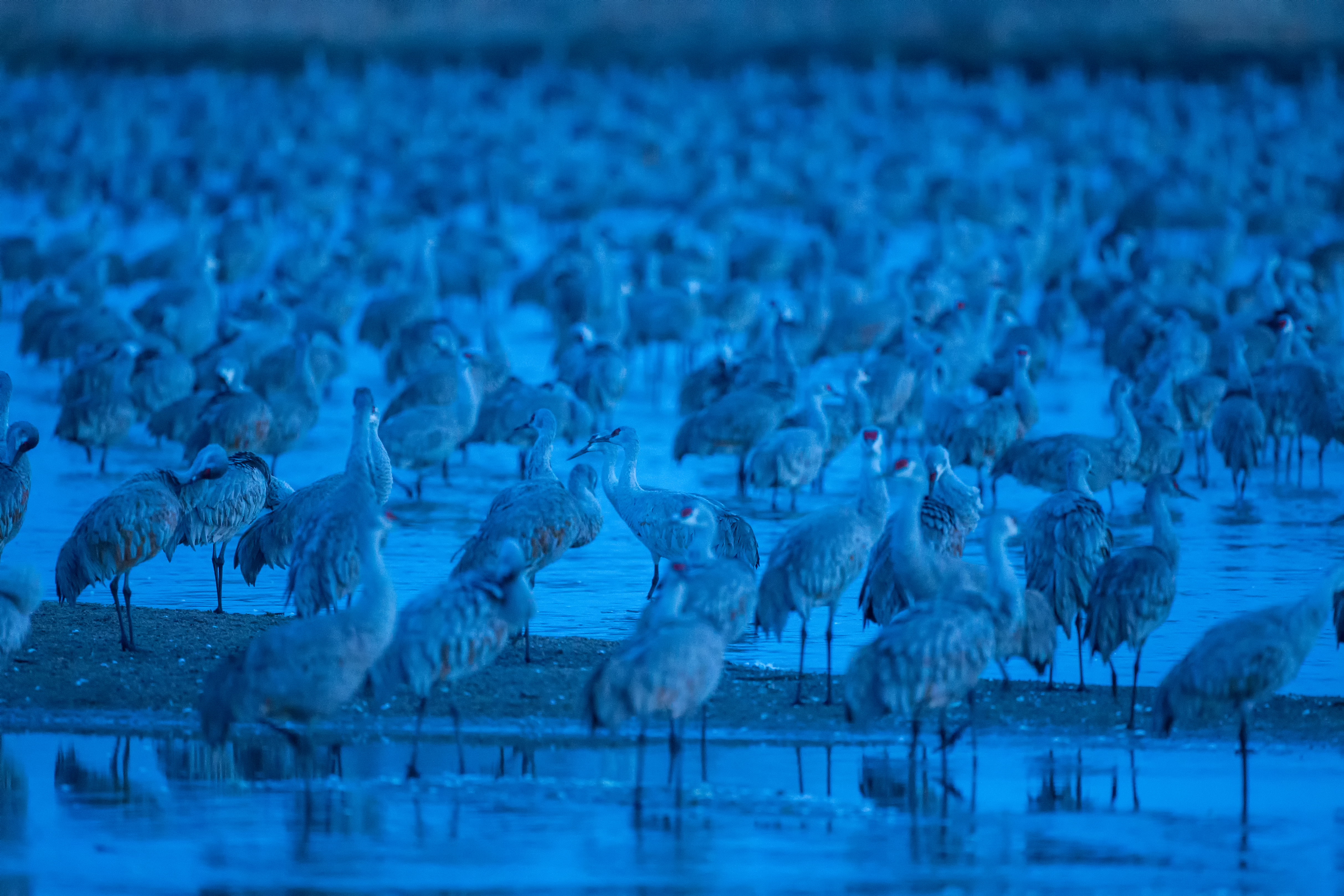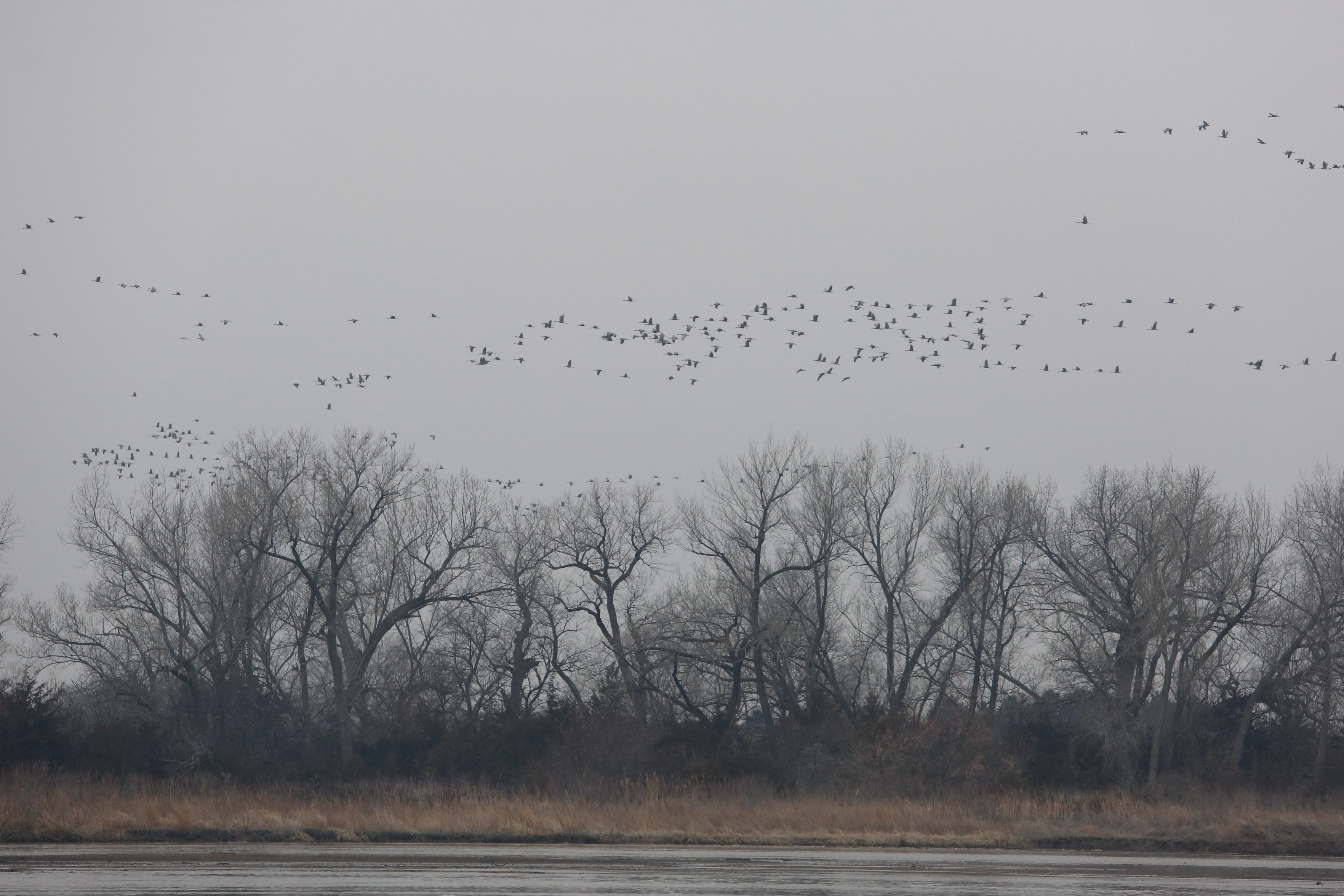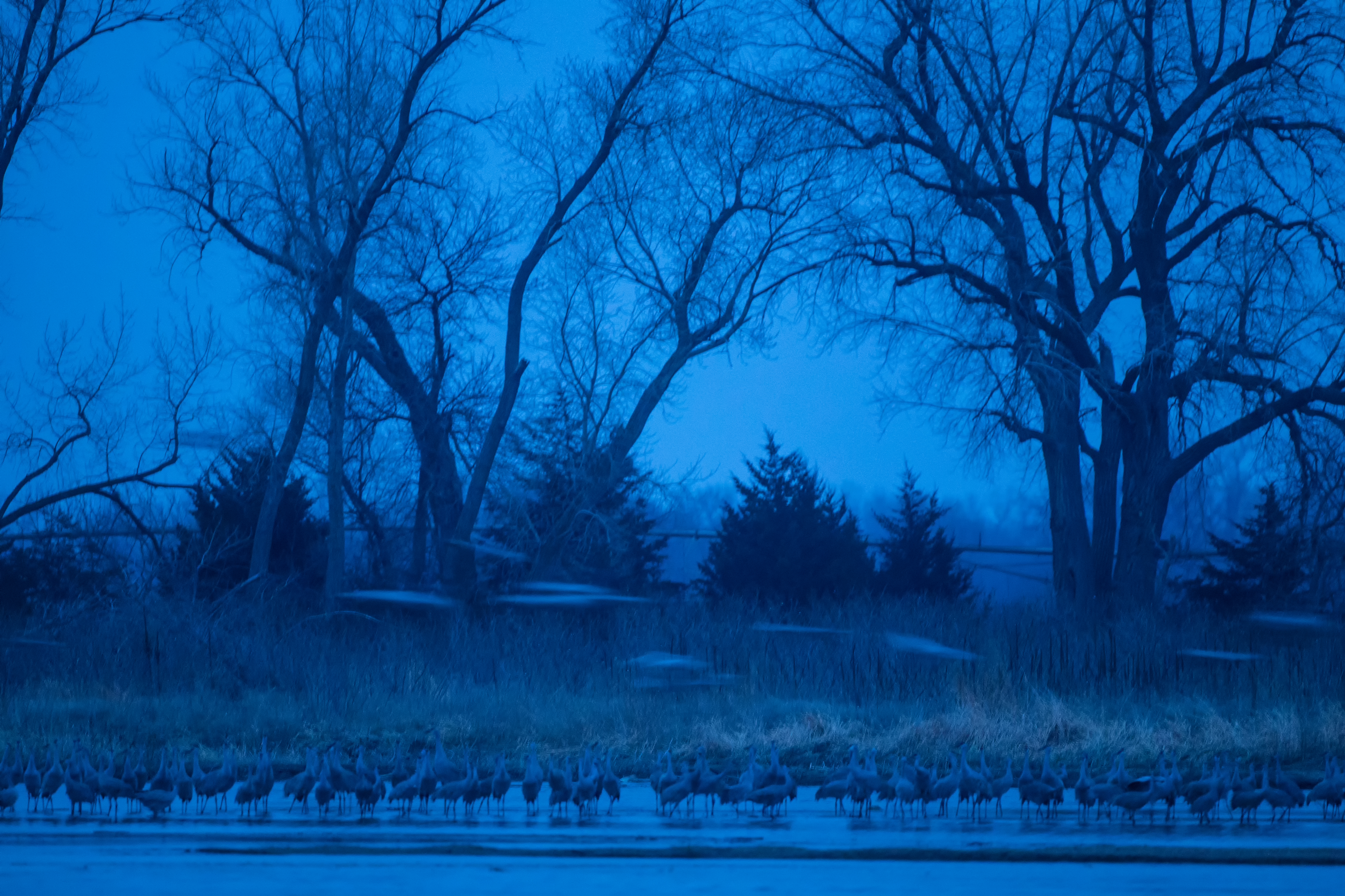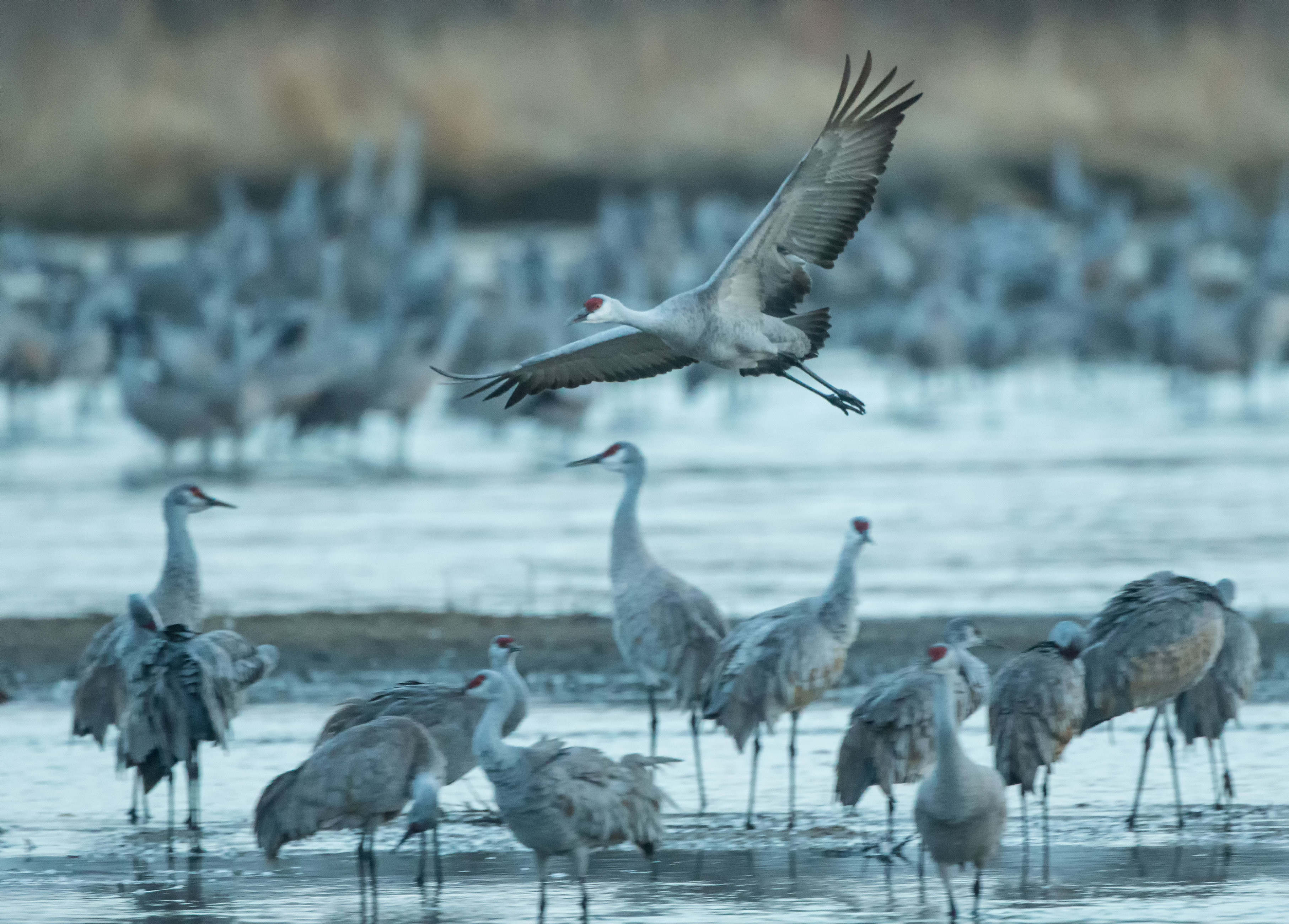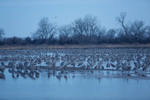 I watched as groups of hundreds and thousands of cranes flew by heading west from my location. For what seemed like hours, they kept coming….but not landing anywhere near my location. I was beginning to think I had reserved a blind and not a single crane was going to land anywhere near me. Finally, about 8:05pm. At dark, the first group landed across the river from me and then they kept coming and coming. Unfortunately, it was too dark to get many good images. But I knew there would be cranes there in the morning.