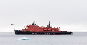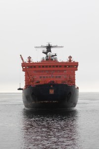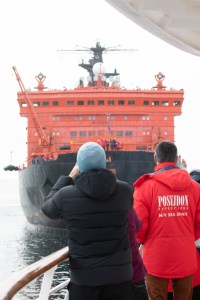 Toward the end of our cruise, this 75,000 horsepower, Russian nuclear icebreaker on lease to the company that ran our trip met up with us. The I/B 50 Years of Victory is making three trips this year to the North Pole. It offers 124 people the chance to actually go to the North Pole and then fly over it on the ship-based helicopter.