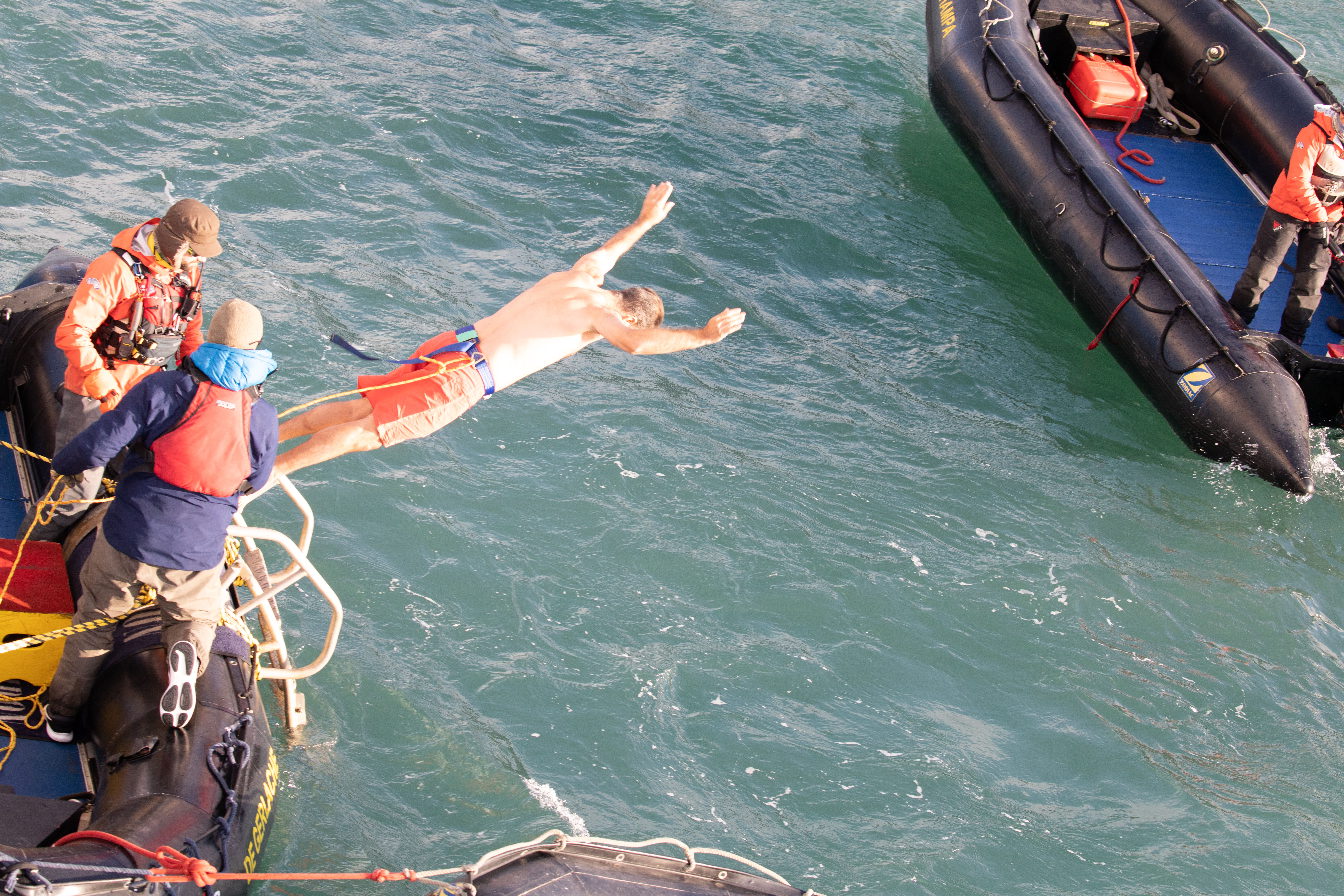 One of the highlights of the trip was the polar plunge. Water temperature was 30 degrees Fahrenheit. Twenty-one intrepid folks got a rope around the waist before diving or jumping into the Arctic Ocean and then quickly, very quickly, returning to the zodiac and up the ladder to the ship.