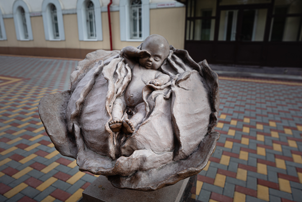 In Russia, babies are not delivered by the stork. They are found in cabbage patches. So, in front of the children’s hospital is a sculpture of a baby in a head of cabbage.
